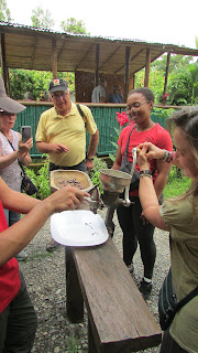 first the seed is roasted until it cracks like pop corn...then you roll it in the palm of your hand removing the shell....the seed then goes to the old meat grinder for prep back to the frying pan where it will melt and brown sugarcane will be added to sweeten it and it is ready for tasting and a chocolate drink.